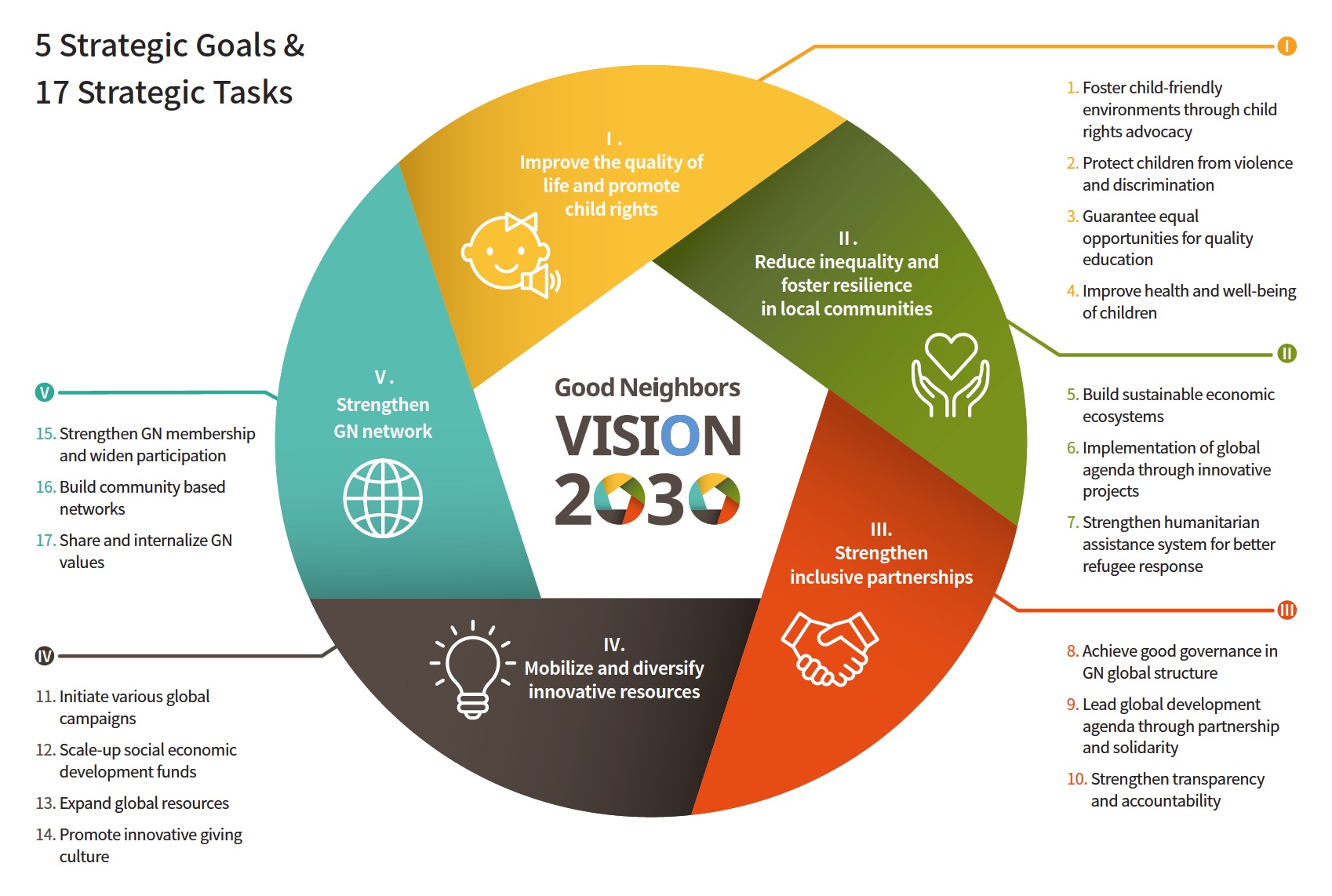 Sejalan dengan Good Neighbors 2030 Vision, Gugah Nurani Indonesia berfokus pada 5 tujuan strategis dan mewujudkannya lewat 17 aksi nyata.