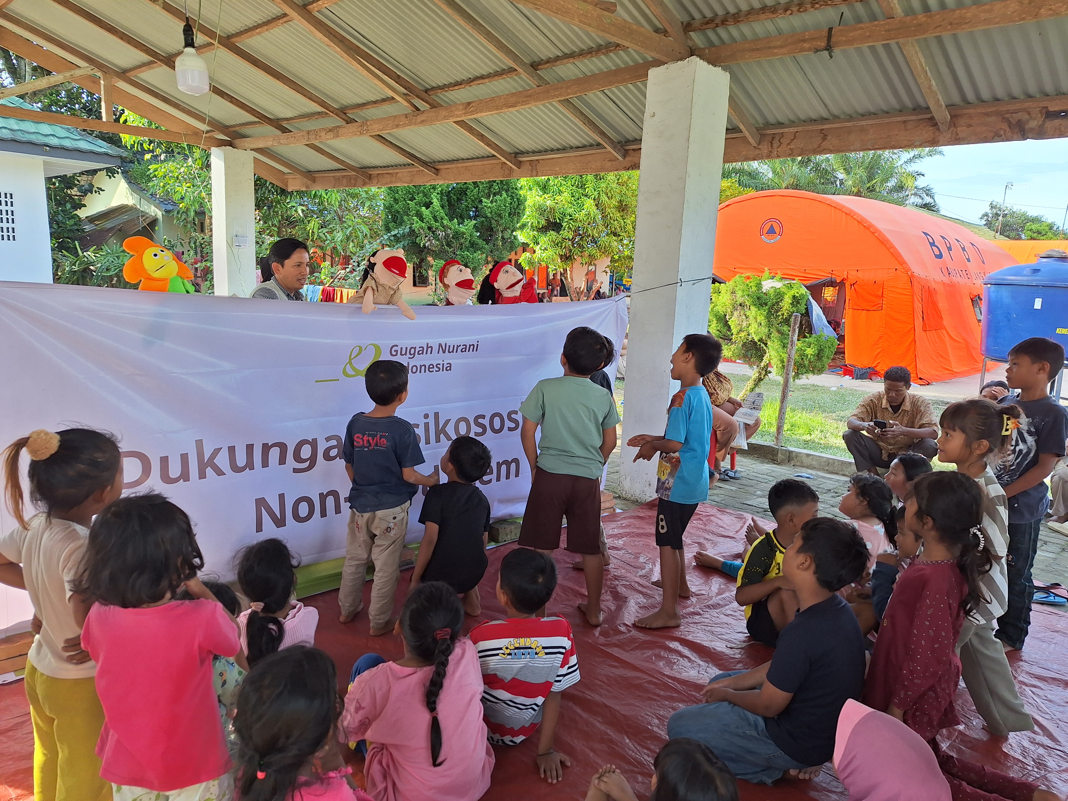 Gugah Nurani Indonesia melaksanakan kegiatan psikososial dengan metode melalui storytelling dengan boneka yang dikemas secara menarik dan terapeutik. Metode psikososial ini memilki pendekatan yang interaktif. Anak diajak untuk aktif berpartisipasi dan berinteraksi dengan satu sama lain. Selain itu, anak-anak juga diajak untuk menggambar perasaan mereka saat bencana terjadi yang dilanjutkan dengan kegiatan bernyanyi bersama.